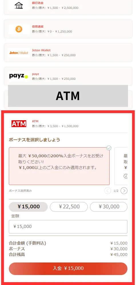 ② 「インスタント銀行送金」・「銀行送金」・「ATM」を選択します。