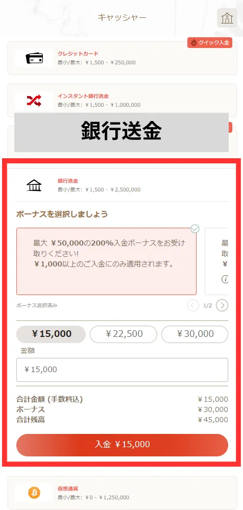 「インスタント銀行送金」は即時銀行振込となります。「銀行送金」と「ATM」は即時ではないため着金の反映に少し時間がかかります。
