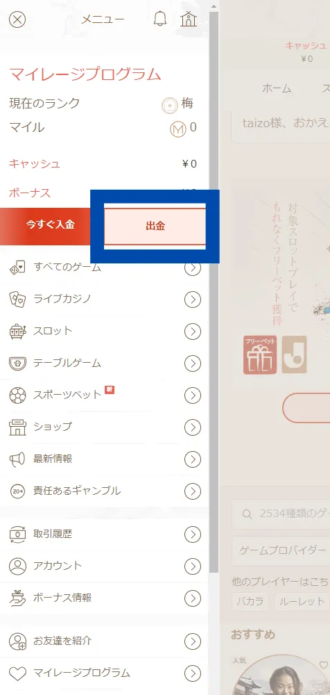 「出金」をクリックすると入金方法の選択画面に移動します。