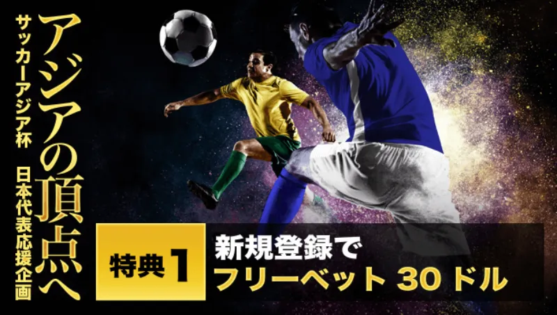 これらはアジアカップが開催された時に行われた、サッカーに関連するプロモーションです。新規登録でフリーベットが30ドル貰えたり、入金30ドル以上でDAZNが3か月無料になったりと豪華なプロモーションを提供していることが分かると思います。