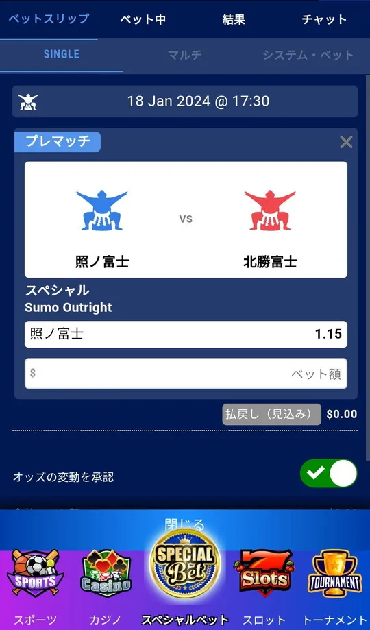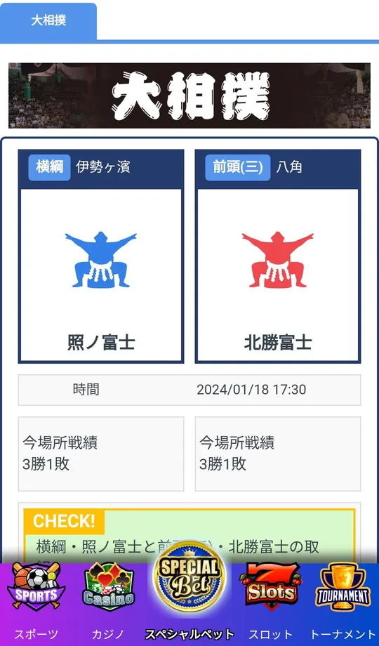 ビーベットでは大相撲にもベットすることができます。場所が始まると連日取組みが行われますが、ビーベットではスペシャルベットとしてそれぞれの取組みにオッズを設定します。
