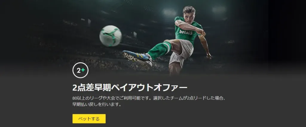 bet365でサッカーにベットすると、2点差がついた時点で勝利を確定させることができる機能です。サッカーでは2点差は危険なスコアとされ、2点差から同点・逆転される試合が日常茶飯事なのです。