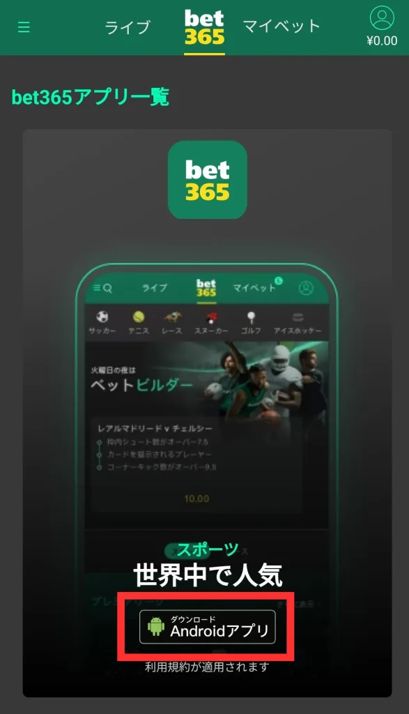 但し、bet365は国内向けにはandroidのアプリしかリリースしていないので注意してください