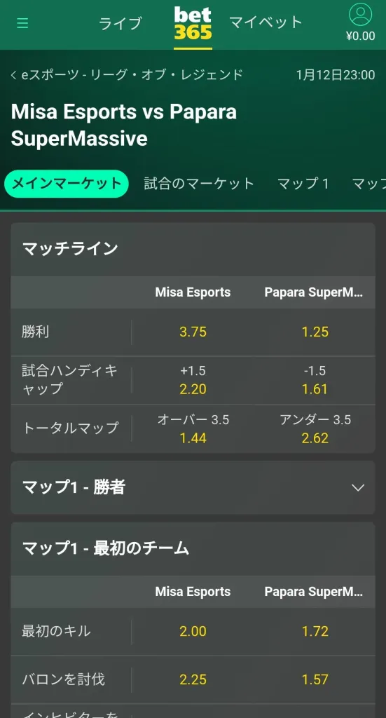 bet365はダークモードを基調とした見やすいUIを採用しています。ベット画面もスッキリしていて、初めて利用するというユーザーの方も簡単に操作できそうです。