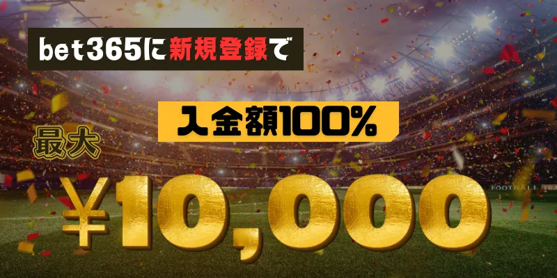 bet365では新規登録者ボーナスが用意されています。ユーザーはbet365に新規登録して30日以内に初回入金・初回ベットをすると、最大で10,000円のボーナスを受け取ることができます。このボーナスを上手に利用することでリスクなしでスポーツベットを楽しめます!