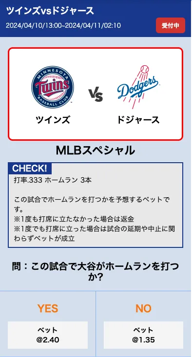 例えば、大谷翔平選手が出場する試合に際して、「大谷選手がホームランを打つかどうか」「大谷選手が盗塁を記録するかどうか」など、日本人選手にフォーカスを当てたベットオプションをスペシャルベットとして提供しています。
