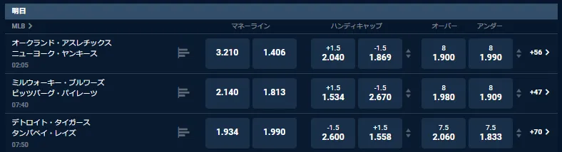 メジャーリーグに関するオッズはブックメーカーによって異なります。