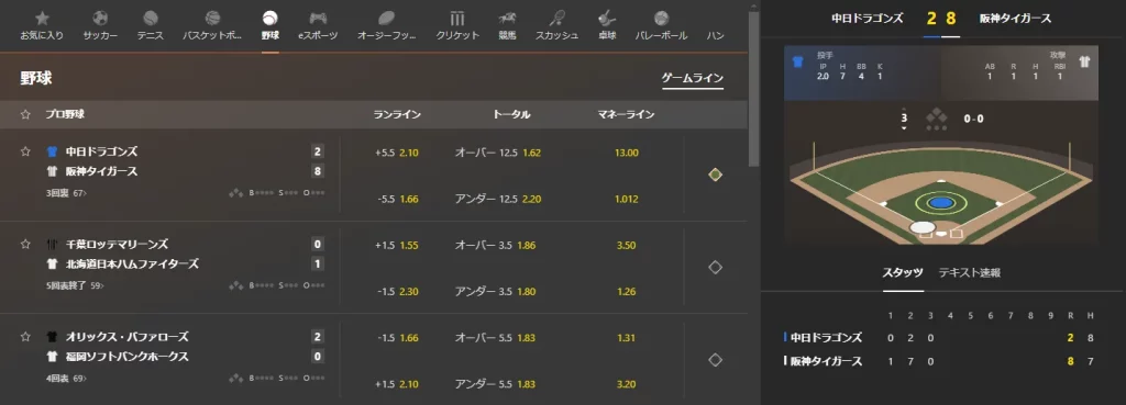 特定のイニングにおける試合内容にベットすることができます。