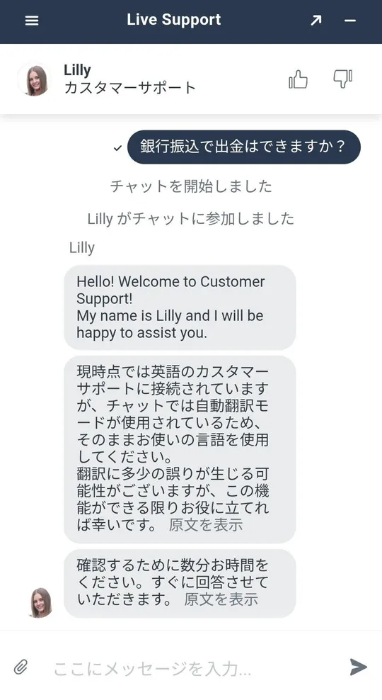 ライブチャットは24時間サポートですが、必ずしも日本語サポートに接続されるわけではありません。英語の翻訳を介してのサポートとなることもあります。