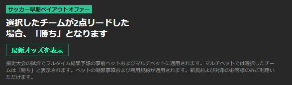 サッカーの試合でベットしたチームが2点をリードした時点で的中扱いとなるスペシャルベットです。