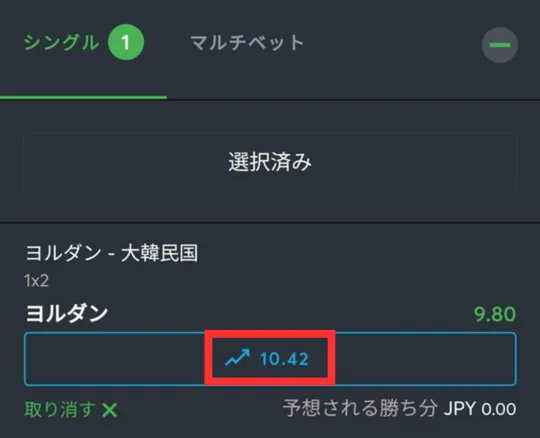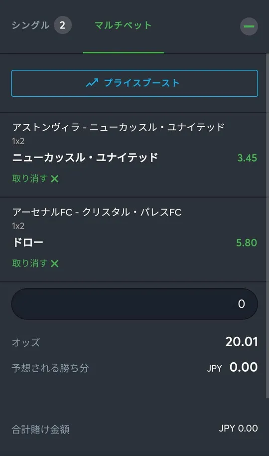 プライスブーストはシングルベットに適用されます。マルチベットで複数の試合を選択してもプライスブーストでオッズが上がるのはそのうちの1つの試合のみです。