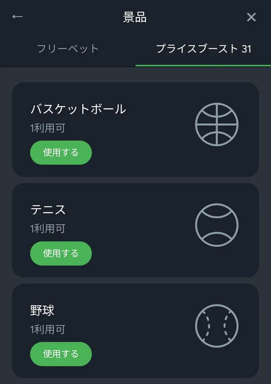 プライスブーストでは24時間ごとに1回利用できますが、これは全てのスポーツカテゴリーで24時間ごとに1回利用できるという意味です。