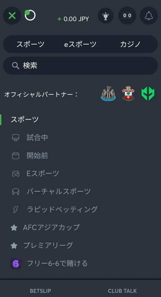 スポーツベットアイオーはダークモードを基調にしているとても見やすいデザインです。明るい画面が好みの方はライトモードを切り替えることができます。